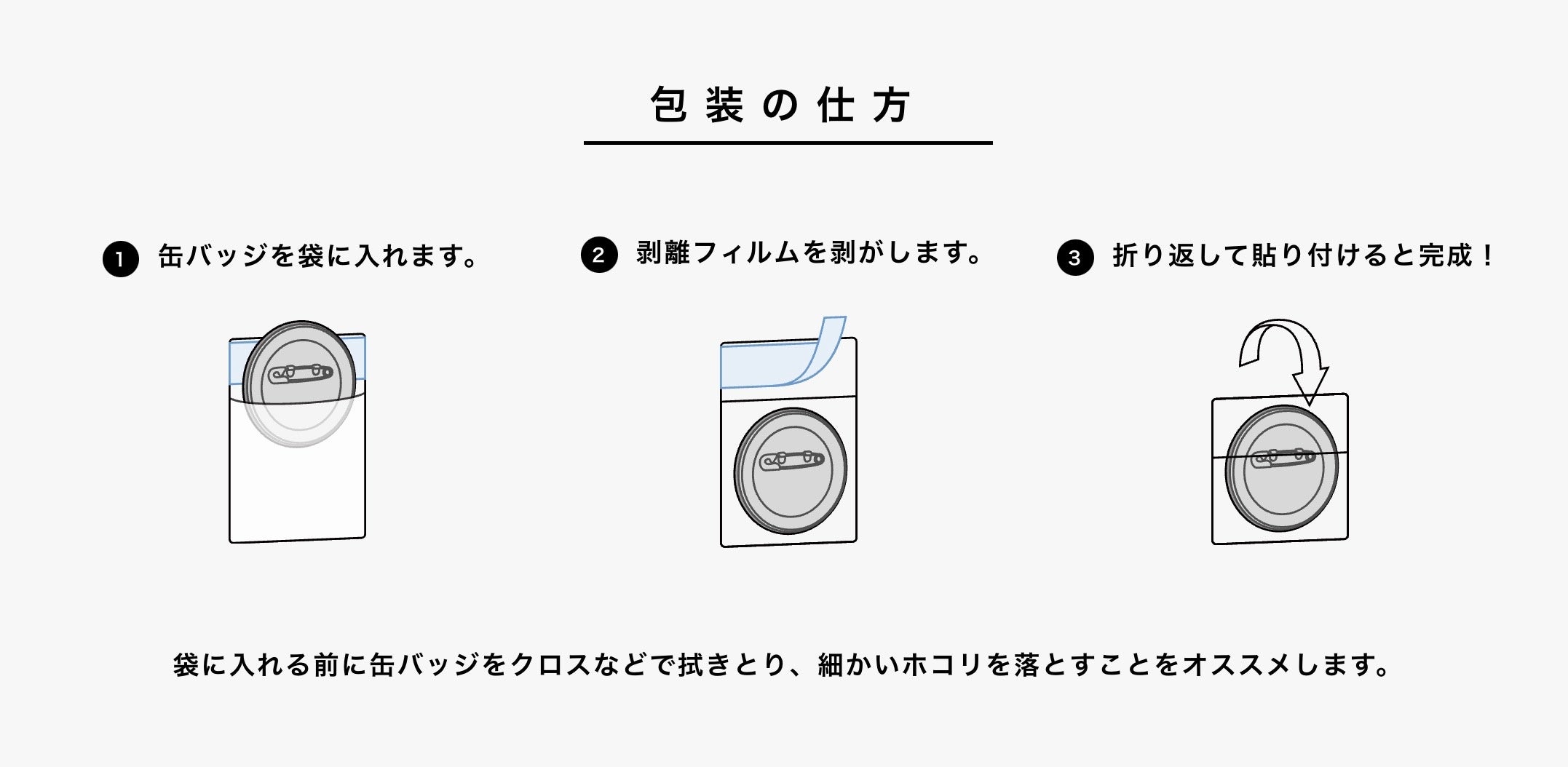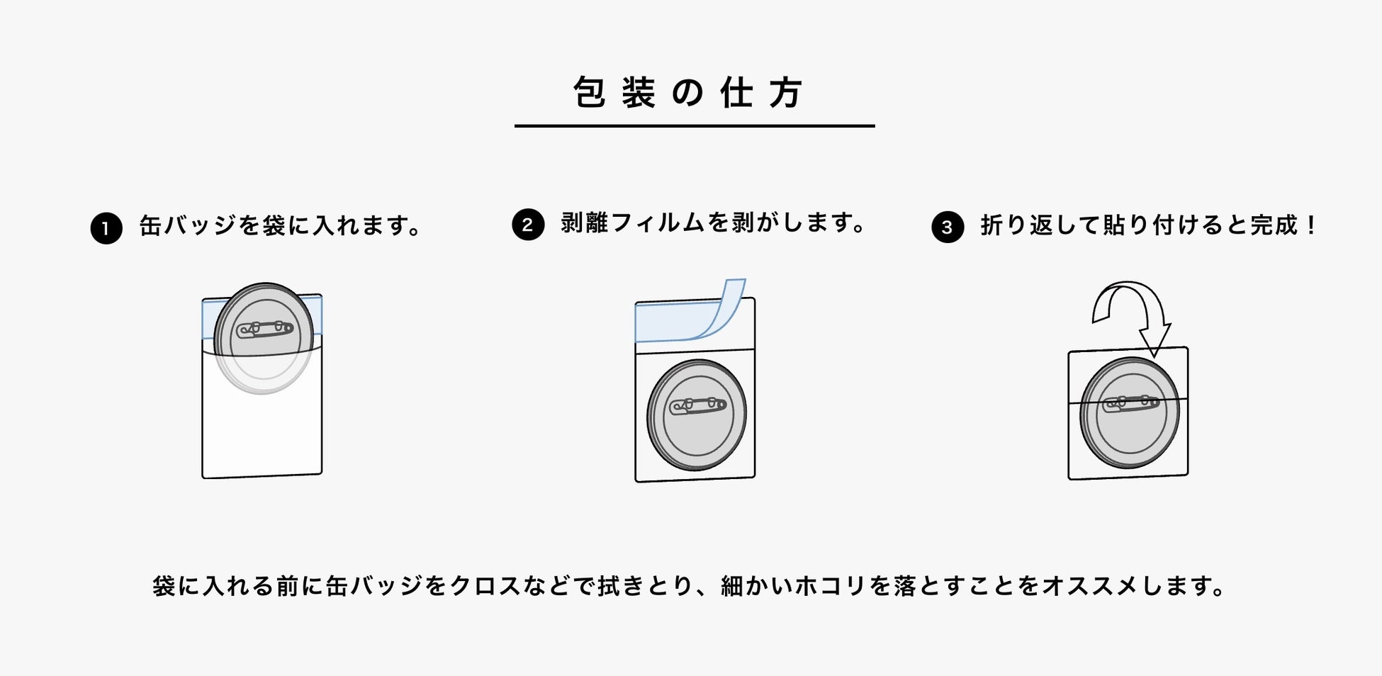 各サイズに合わせたOPP袋を缶バッジと同梱してお届けします。
