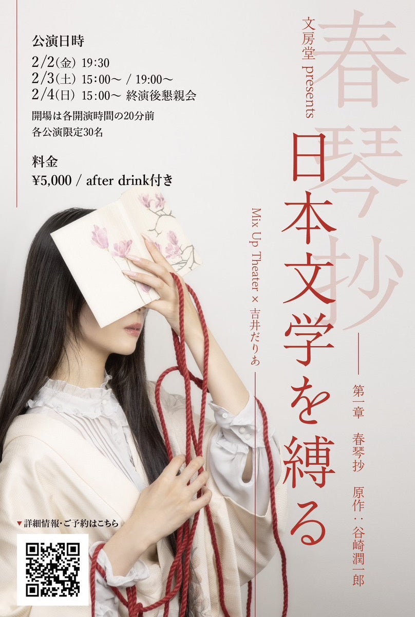 Team Mix Up misc.が様々なアーティストとコラボレーションし、日本文学との化学反応を楽しむイマーシブシアター(没入型演劇)シリーズ。第一弾となる本公演では、日本の伝統文化である緊縛を用いたパフォーマンスを手掛ける吉井だりあとともに、谷崎潤一郎の名作「春琴抄」の世界へと観客の皆様を誘います。