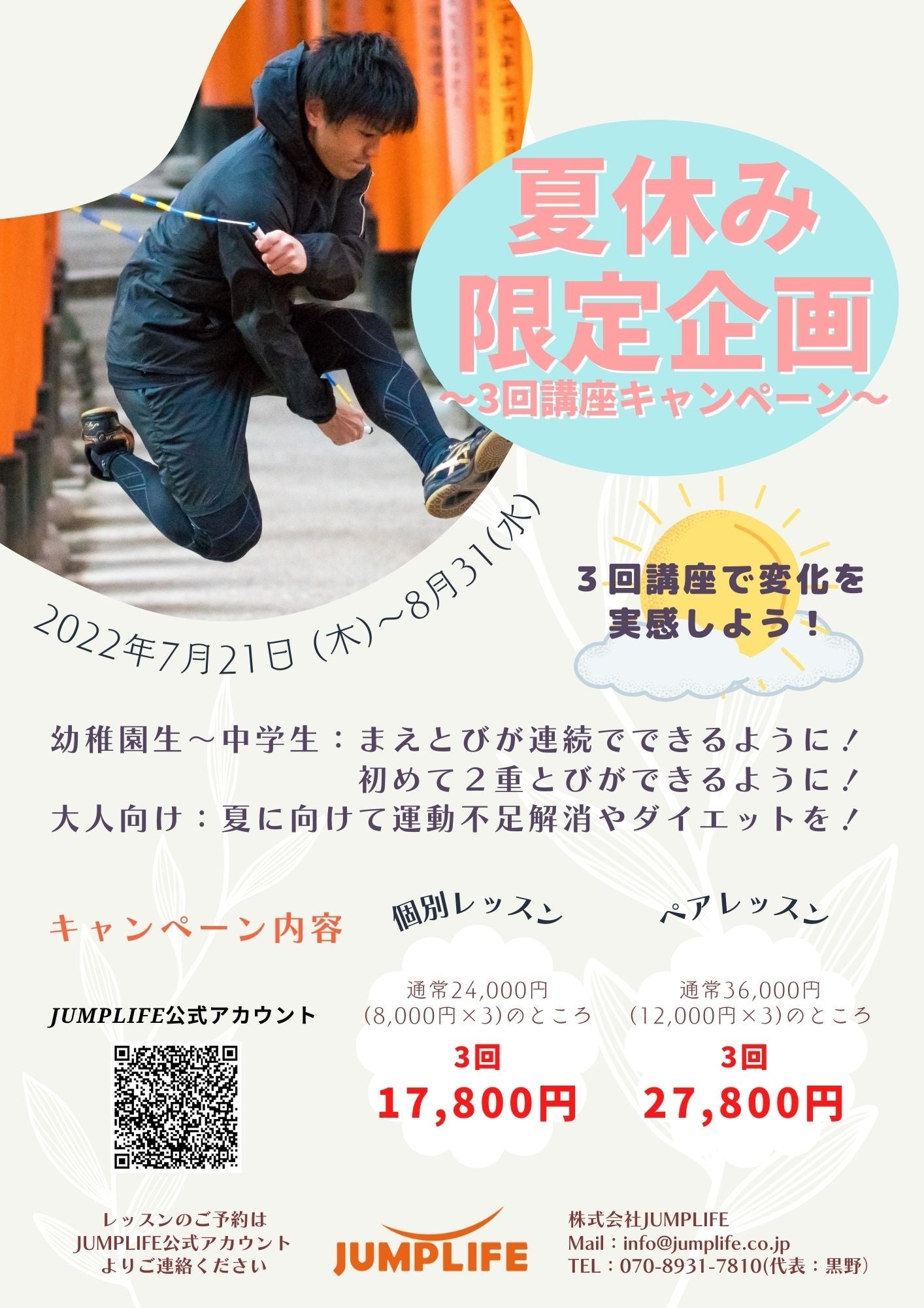 株式会社JUMPLIFE(代表取締役社長:黒野寛馬、所在地:大阪府豊中市)は、幼稚園生〜大人を対象にした特別なわとび講座を2022年7月21日(木)〜2022年8月31日(水)まで開催します。本講座は1回45分×3回の特別講座になっており、小学校受験でなわとび運動を行う幼稚園生への前とび指導や、大人の方のなわとびダイエットなど、3回の講座で変化を実感できるよう現役なわとび世界チャンピオンがサポートしていきます。URL:https://jumplife.co.jp/