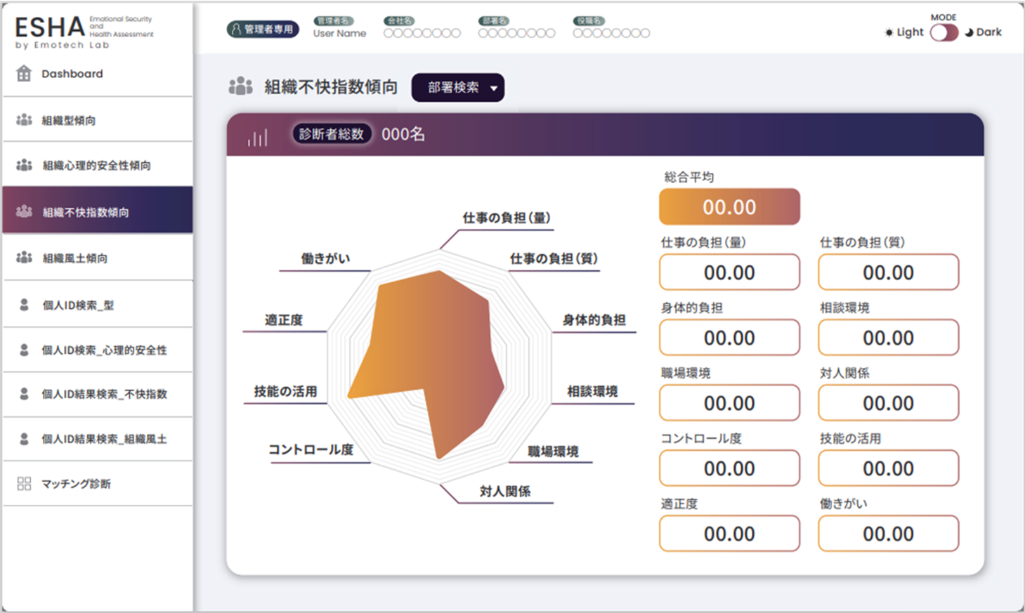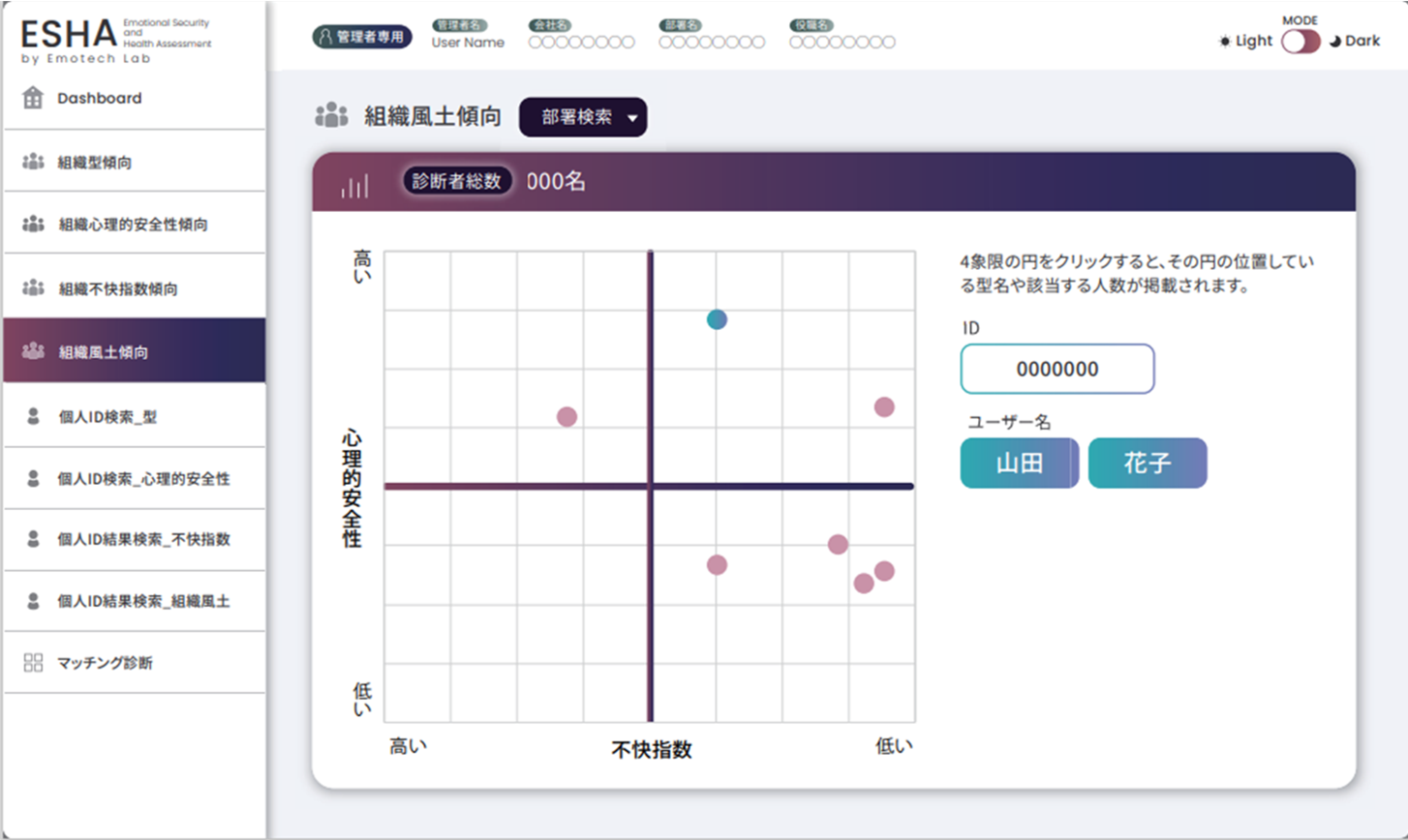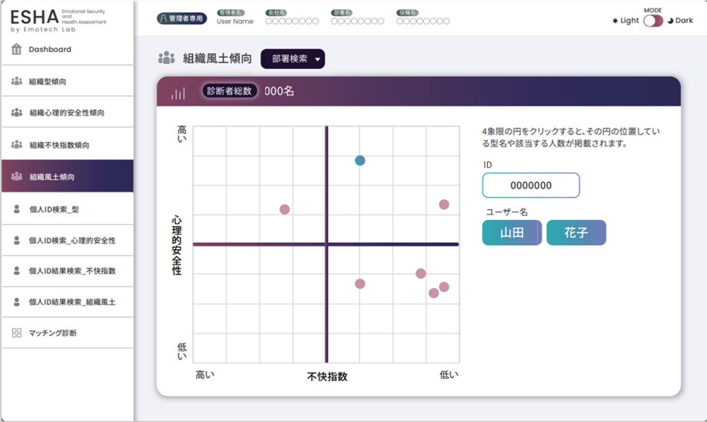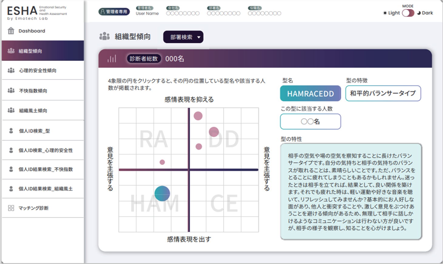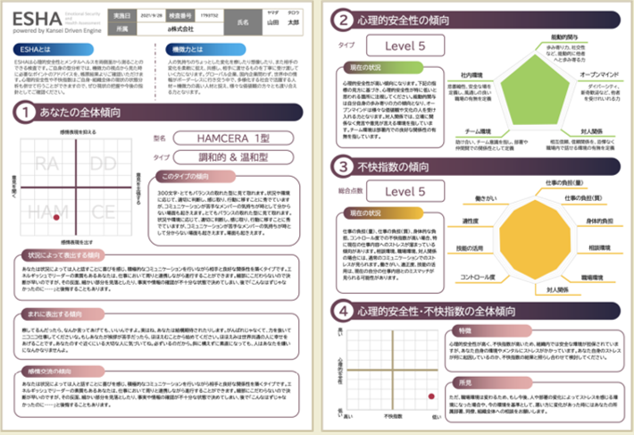 「ESHA」(Emotional Security and Health Assessment)は、心理的安全性の状態を創り出す社員ひとりひとりのマインドを“機微力(人の気持ちを察する力)”に基づいてタイプ別に診断し、現在のココロの在り方を心理的安全性と不快指数の両面から測る診断ツールです。