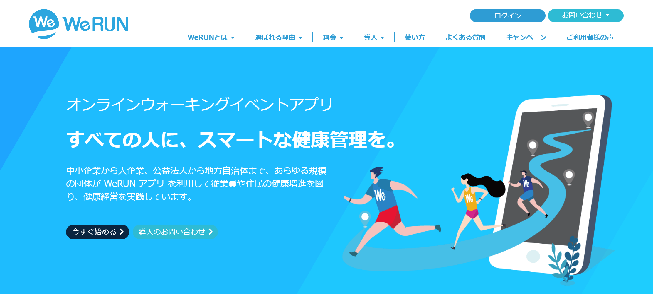 WeRUNはスマートフォンやウェアラブルとの連携端末によって、歩数をはじめ睡眠、心拍数などの健康状態を計測記録し、歩数や距離データを元に多様なウォーキングイベントを簡単に開催できるアプリです。