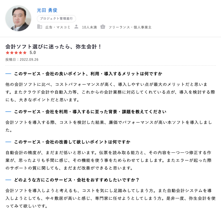 実際に会計ソフトを活用しているフリーランスから「生の声」をレビューとして幅広く収集
