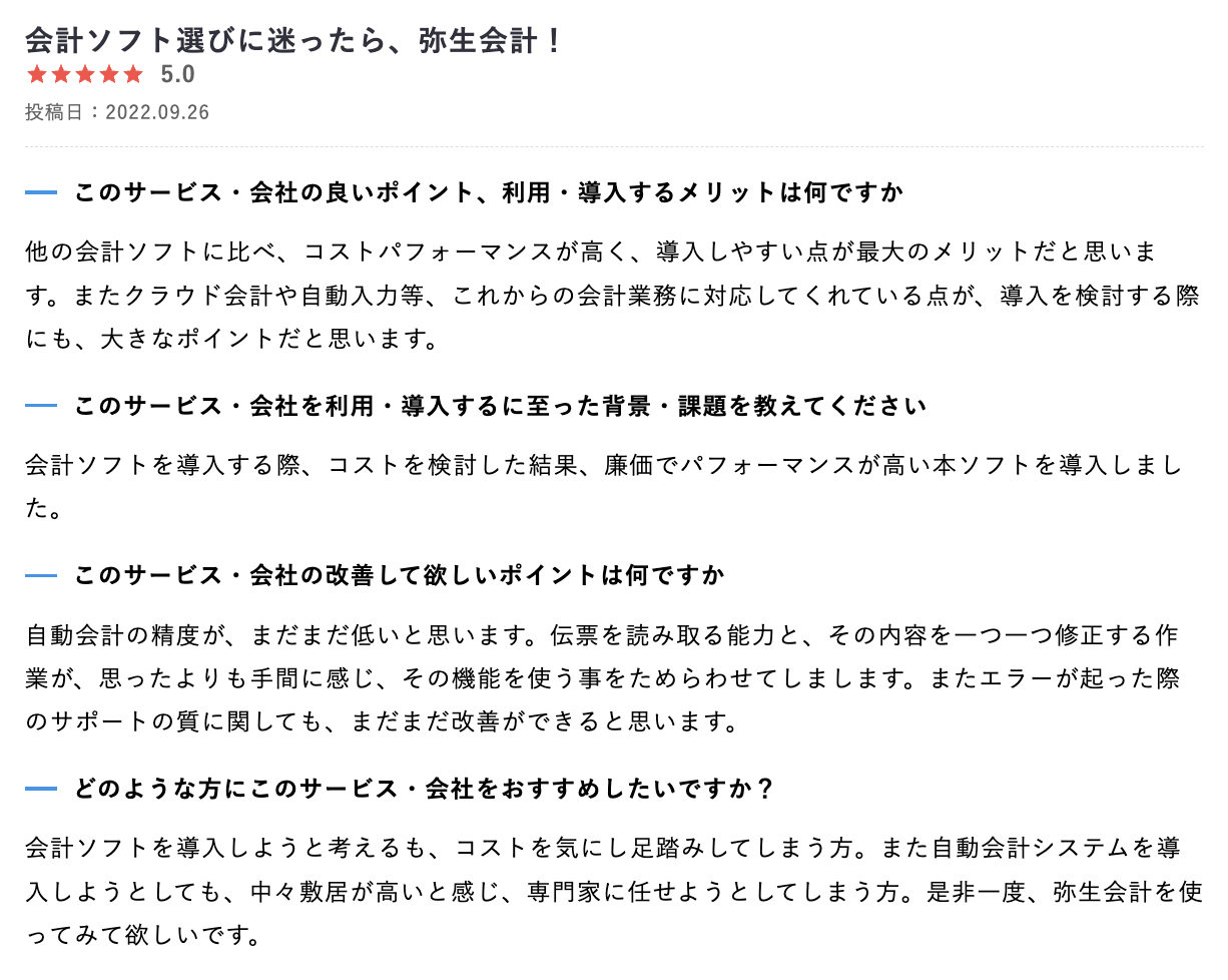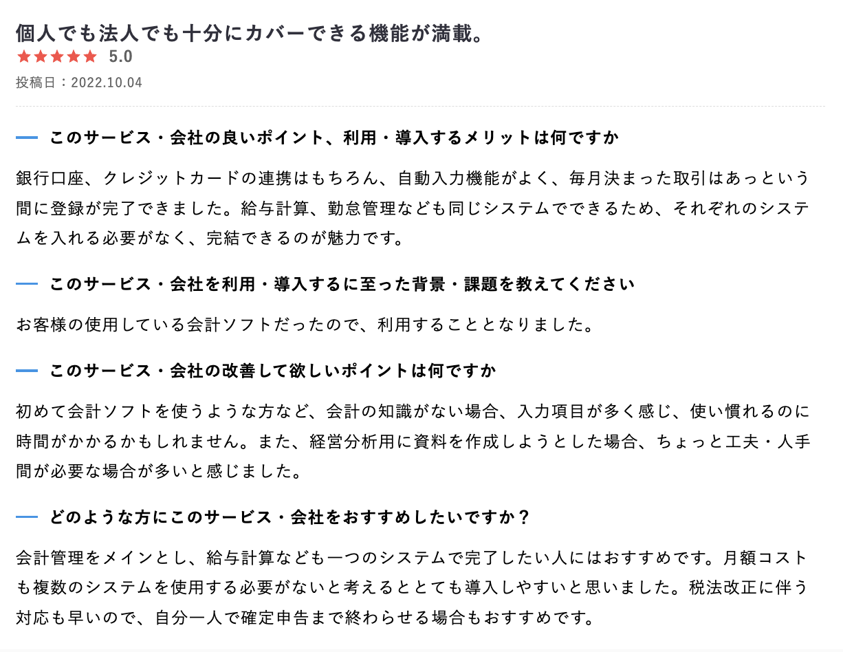 会計管理だけではなく給与管理、勤怠管理も一気通貫でできる点など、スピード感を評価されたレビューなど投稿されております。