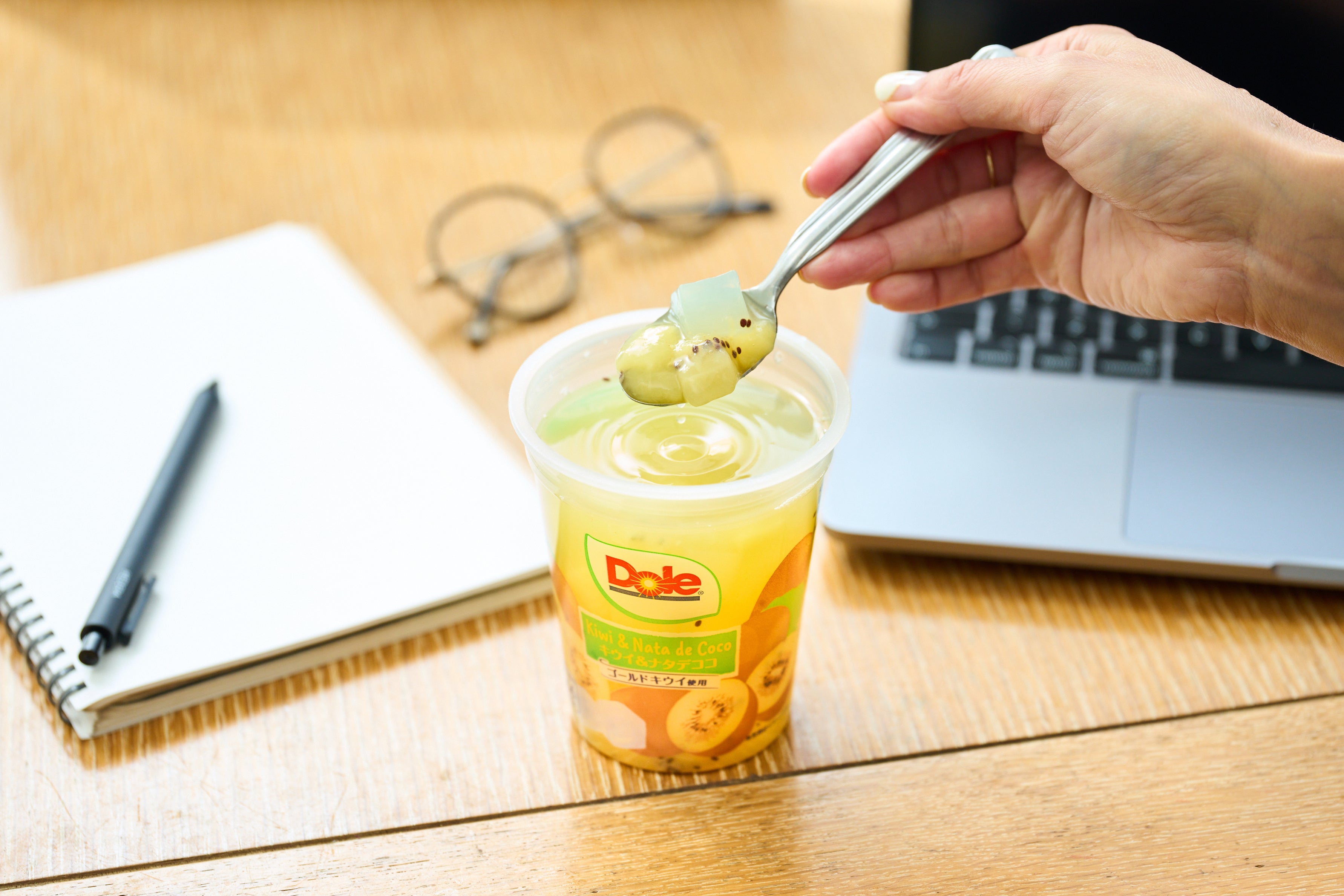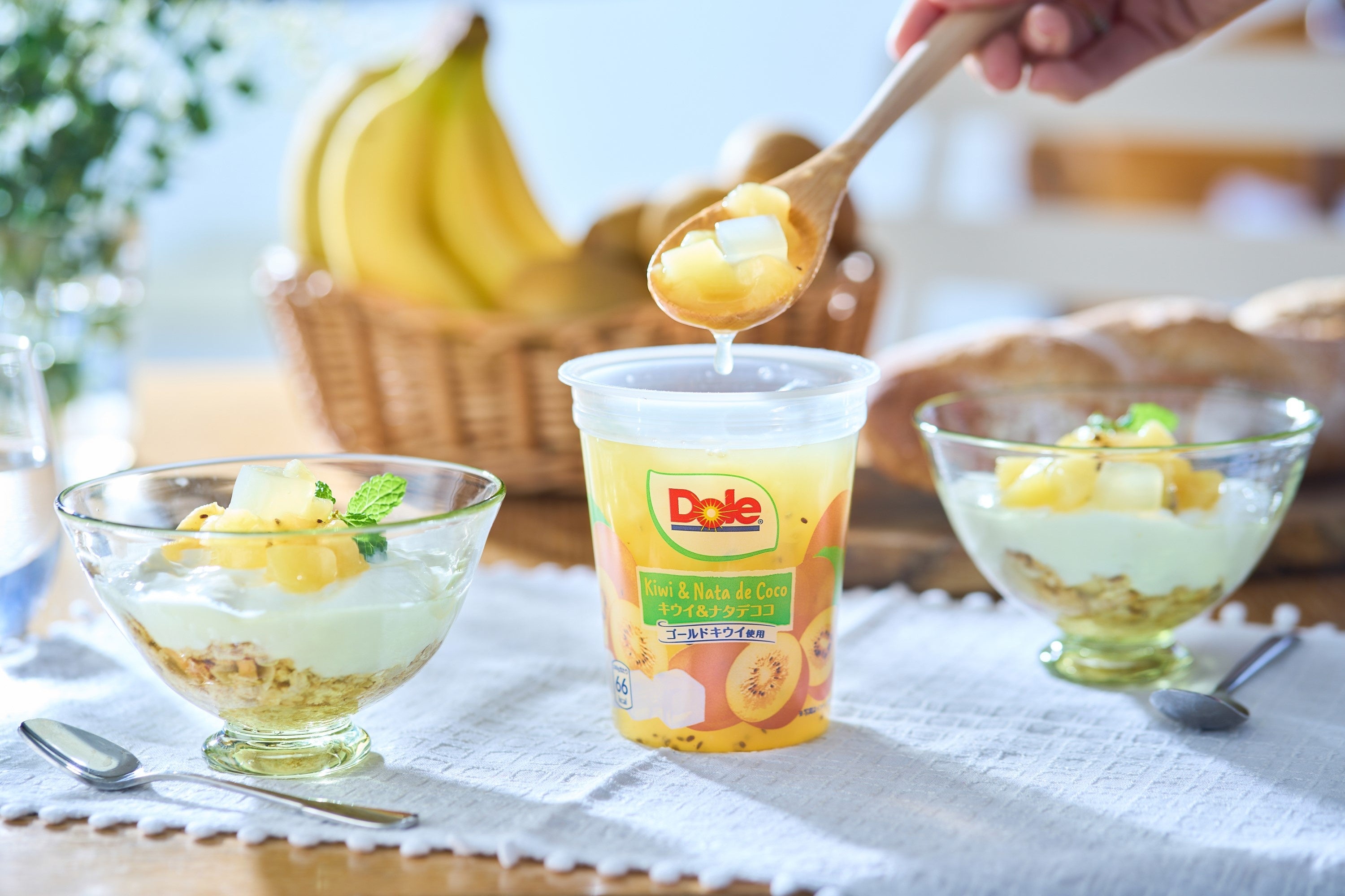 ドールの『フルーツカップ』は、手軽に毎日フルーツを食べられるように、食べやすくカットしたフルーツと果汁を使用した商品です。今回登場する『キウイ&ナタデココ』では、ニュージーランド産ゴールドキウイを贅沢に使いました。プチプチとしたキウイの種と、コリコリとしたナタデココによる“新食感”が楽しめるフルーツカップです。