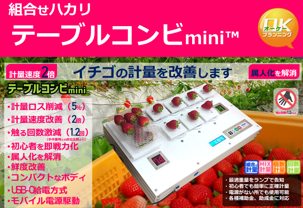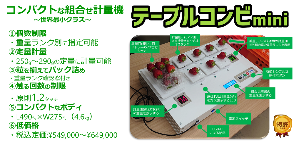 イチゴの計量を合理化するために開発した「テーブルコンビmini」を7月20~22日に東京ビッグサイトにて「施設園芸・植物工場展(GPEC)」に出展します。