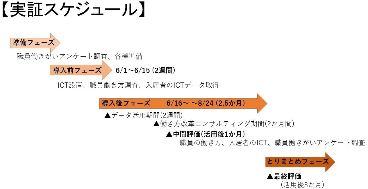 この度の3社での実証では、「サービス付き高齢者向け住宅 さくらす」に「まもる~の」を導入し、得られたデータから業務効率化や、情報共有を実現することで、ICT機器の導入が『働きがい』向上に繋がるかを実証します。