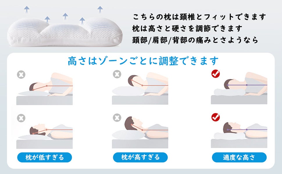 こちらは人間工学により枕を4部分に分けます。異なる寝姿とニーズが対応可能、こちらの枕は頚椎に十分のサポートを提供します。頚椎部分への圧力を緩和し、よりリラックスさせます。仰向きと横向きで寝る方に最適です。