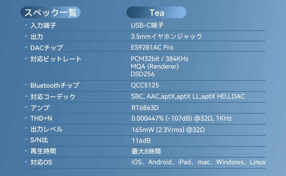 サンプリング周波数:PCM:最大768KHz @ 32ビットDSD:最大DSD256 @ 1ビット