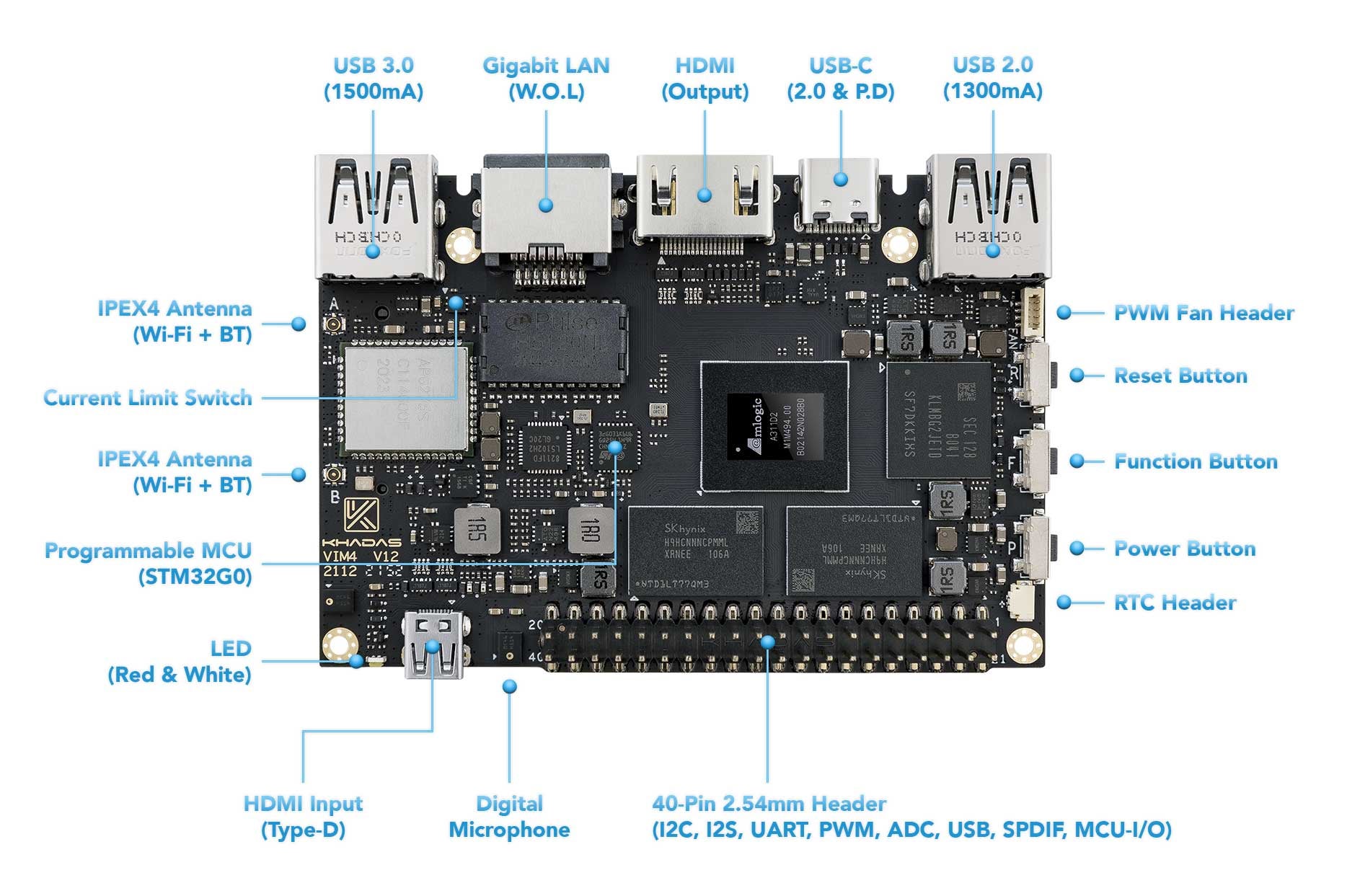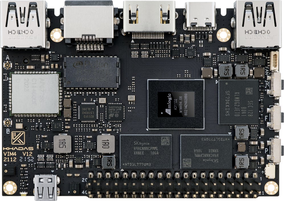Khadas VIM4は、AmlogicA311D2を搭載し、より高速な8GB LPDDR4 RAMで追加のメモリ許容量を有効に活用し、32GB eMMCフラッシュ、ギガビットイーサネット、WiFi 6、4Kp60 HDMI入力および出力、独立したUSB 3.0、およびPCIe(M.2ソケット経由)インターフェイスを提供します。