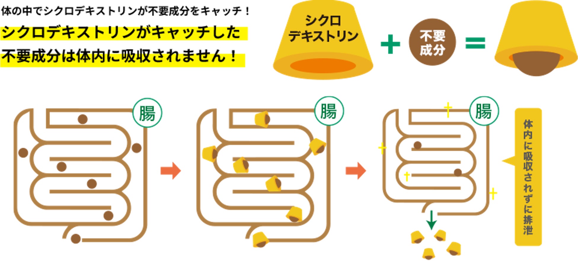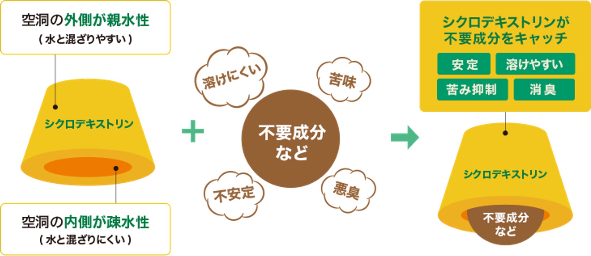 キャッチするというユニークな特徴を有するため、医薬品添加物や日用品、化粧品などに応用されています。また、シクロデキストリンがキャッチした不要成分は、体内に吸収されることなく体外に排出されるため、サプリメントや健康食品にも利用されています。