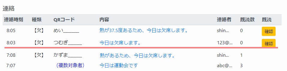 施設側では連絡がリスト表示されます。既読の「確認」ボタンを押すことにより既読数がカウントアップされ、既読を確認することができます。