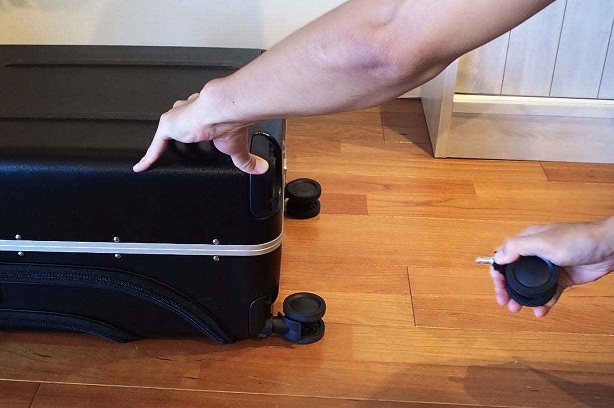キャスター外して、機内持ち込みMAXサイズ。部屋の床も汚さない!勝手に転がらない!交換も簡単!