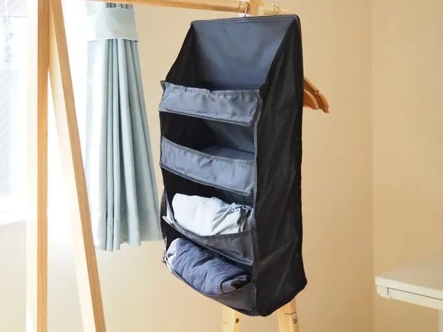 ハンドルを伸ばし、下の段にあるソフトシェルフをハンドルにかければ、棚の完成。
