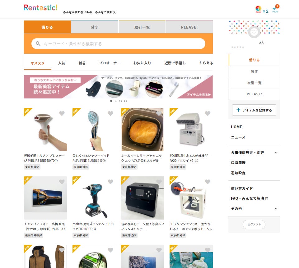 特定のコミュニティ内において、会員個人が所有する様々な資産(アイテム)を会員間で『無償で貸し借りし合う』ことを支援するために開発された、コミュニティ単位で「サステナビリティ・SDGs」、「サーキュラーエコノミー」推進に取り組めるプラットフォームです。コミュニティ内において、自分のアイテムを他のユーザーに1日貸すともらえる「1Renta!」を使うと、別のユーザーのアイテムを1日無料で借りられる。自分のアイテムを他のユーザーに貸した日数分だけ、また別のユーザーのアイテムを無料でレンタルできる。これが「レンタル料無料」を実現する独自スキームとなっています。
