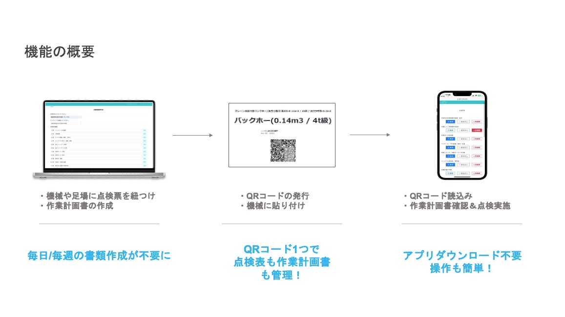 《Arch 安全セーフティ》は全ての建設現場で毎日行われている機械の始業前点検や、作業計画の作成、その他届出書類を紙からデジタルにシフトさせます。