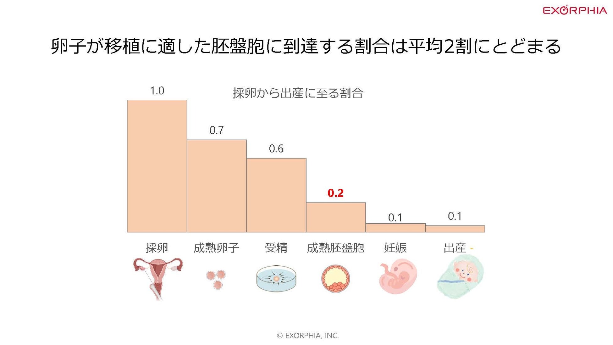 また、採取した卵子が移植に適した胚盤胞というステージに到達する割合は平均2割にとどまり、しかも高齢女性では採取できる卵子の数が減少することから、移植の可能性は更に低下します。