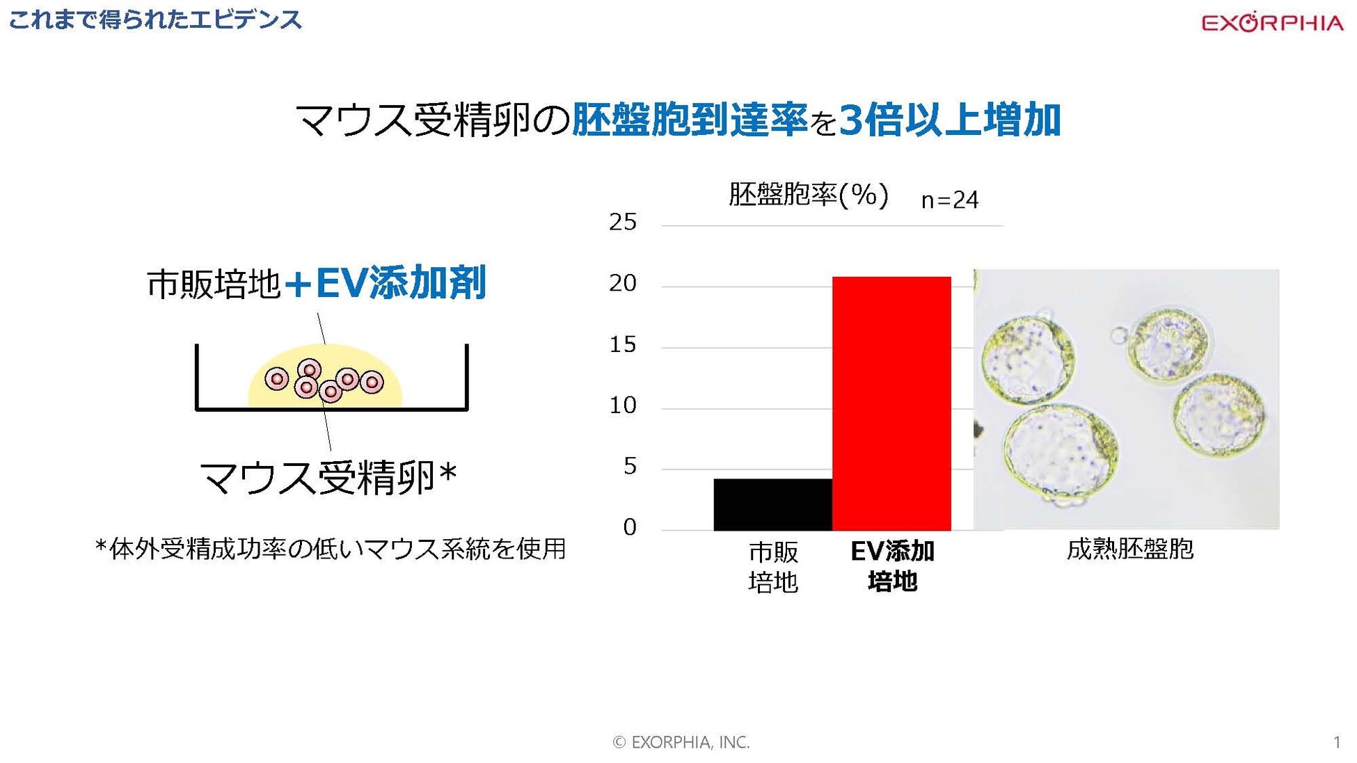 EXORPHIAが開発したEV(エクソソーム)を含有する培地は、受精卵の成熟に重要な成分を豊富に含んでおり、その発育を大幅に促進します(特許出願済)。マウス実験では、胚盤胞到達率が従来の培地と比較して3倍以上向上することが確認されています。