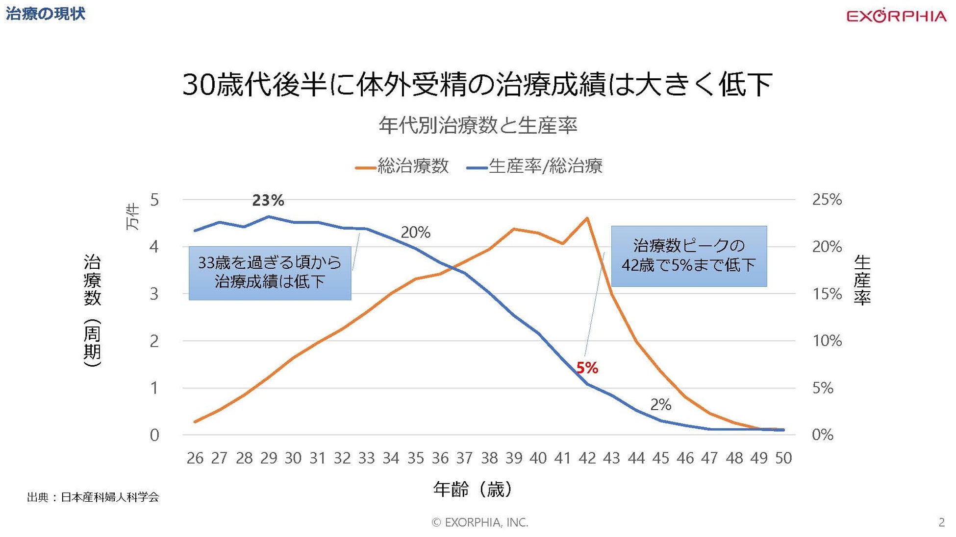 その一方で、主な治療法である体外受精(IVF)の成績(生産率/総治療)は、全年齢平均で13.8%にとどまっています。成功率は年齢とともに低下し、40歳では10%、42歳ではわずか5%と、年齢が上がるほど生児獲得が困難になる現状が浮き彫りになっています。(公益社団法人日本産科婦人科学会調査2022年データ)