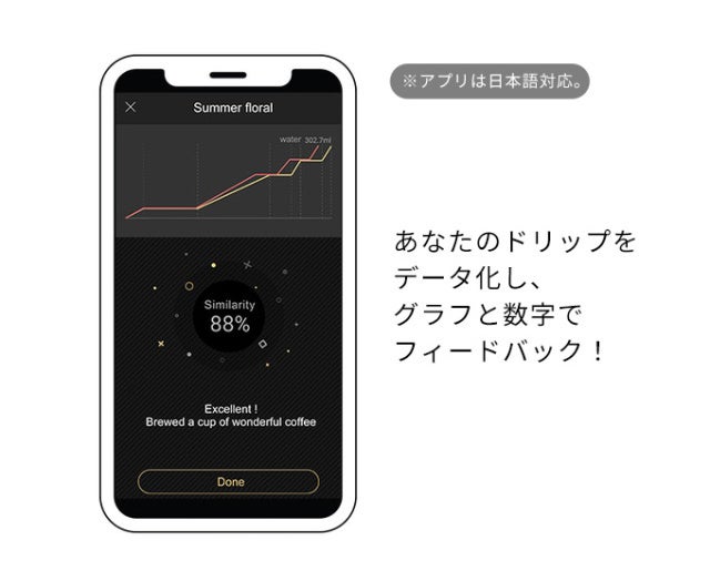 専用アプリを使えば、二次元コードを通して自分のこだわりドリップデータをシェアしたり、バリスタや友人からシェアしてもらって自分で実践してみることも可能。また、ライトガイドモードでコーヒーをドリップすると、アプリが使用したドリップデータとの類似性を即座に比較表示し、あなたにフィードバックします。