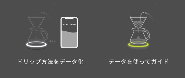自分で見つけたお気に入りのドリップ方法を記録したい場合は、アプリのドリップ記録モードをオンにしてドリップを開始すると、お湯を注ぐスピード、蒸らし時間など、ドリップの各段階でのさまざまな数値を記録します。アルゴリズムを使ってドリップデータをライトガイドモードに変換し、次回からも同じ味のコーヒーを再現することが可能です。