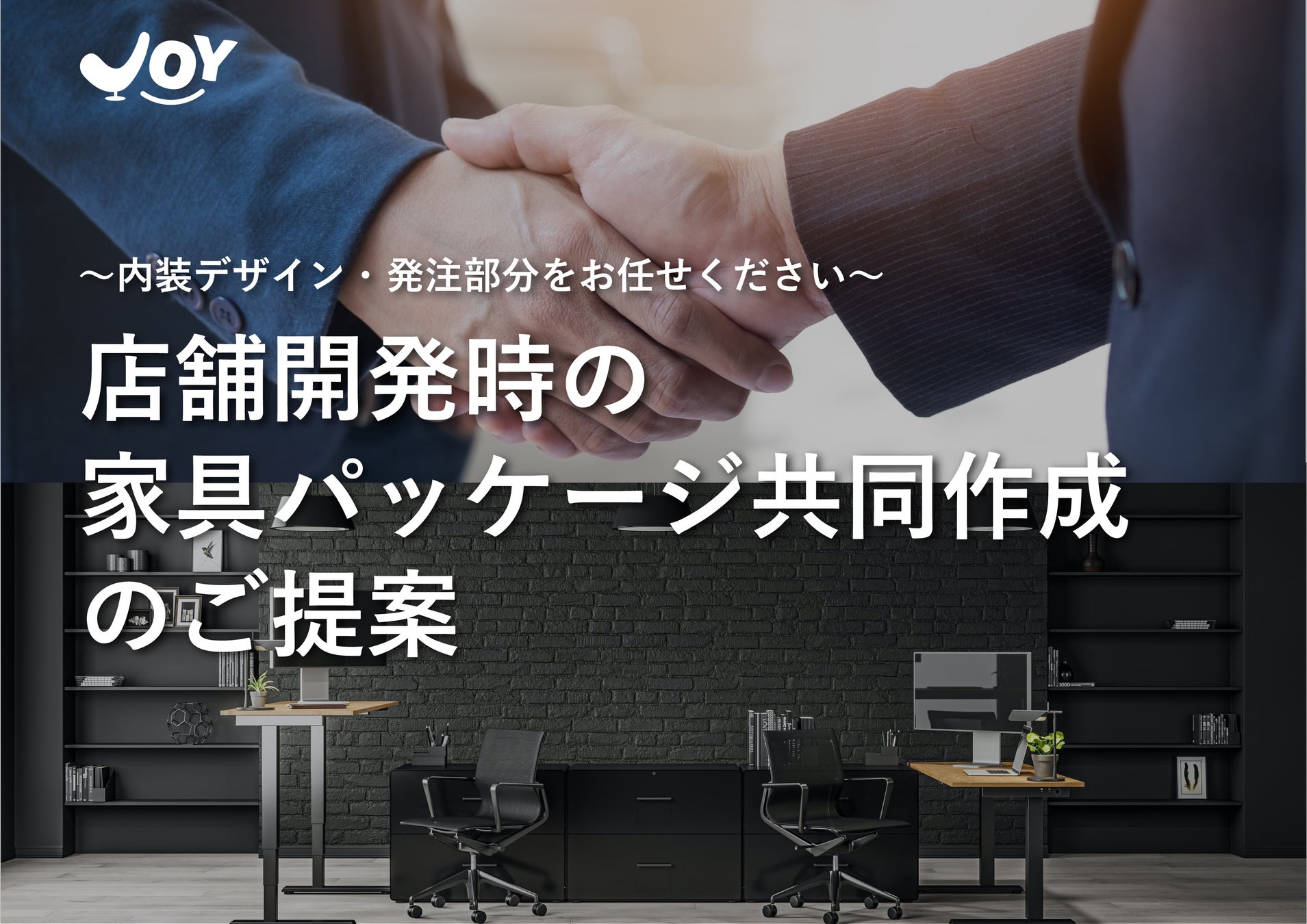 JOY株式会社は、フランチャイズの店舗開発における、家具パッケージを共同製作する企業を募集します。詳細は弊社サービス資料をぜひ一度ご覧ください。