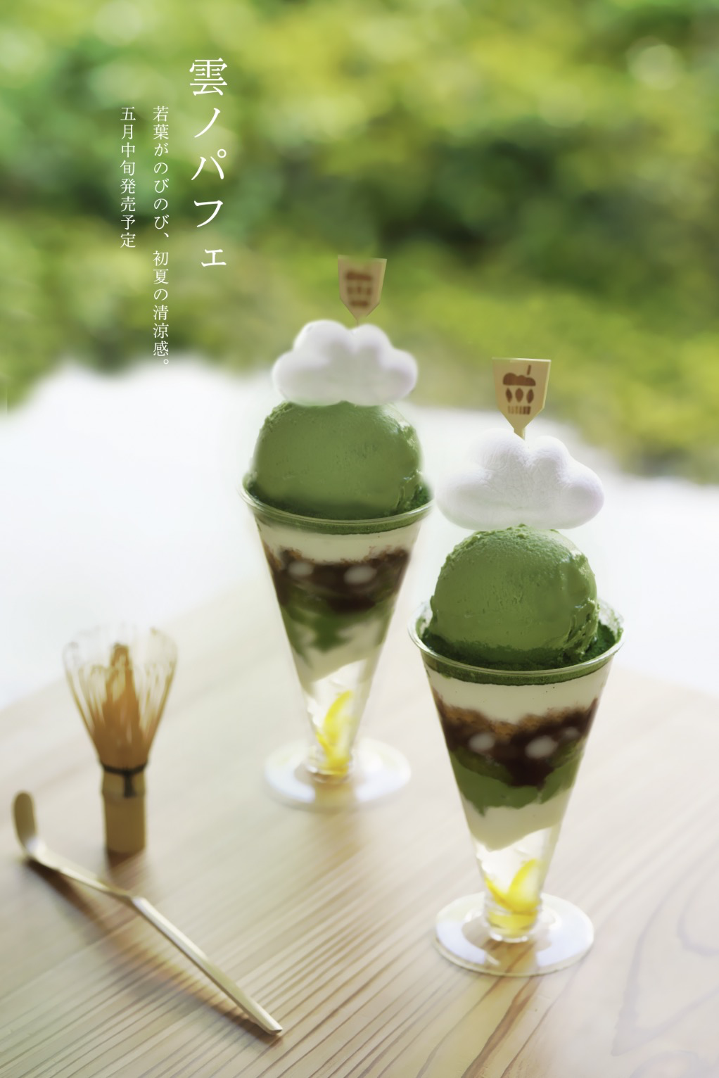 トップのアイスボールの周りに振り注がれる抹茶パウダーは、若葉が拡がっていたところに、葉先より光が降り注ぎ、その瞬間の温度・空気・色調・すべてを閉じ込めてパウダーと化したかのよう。