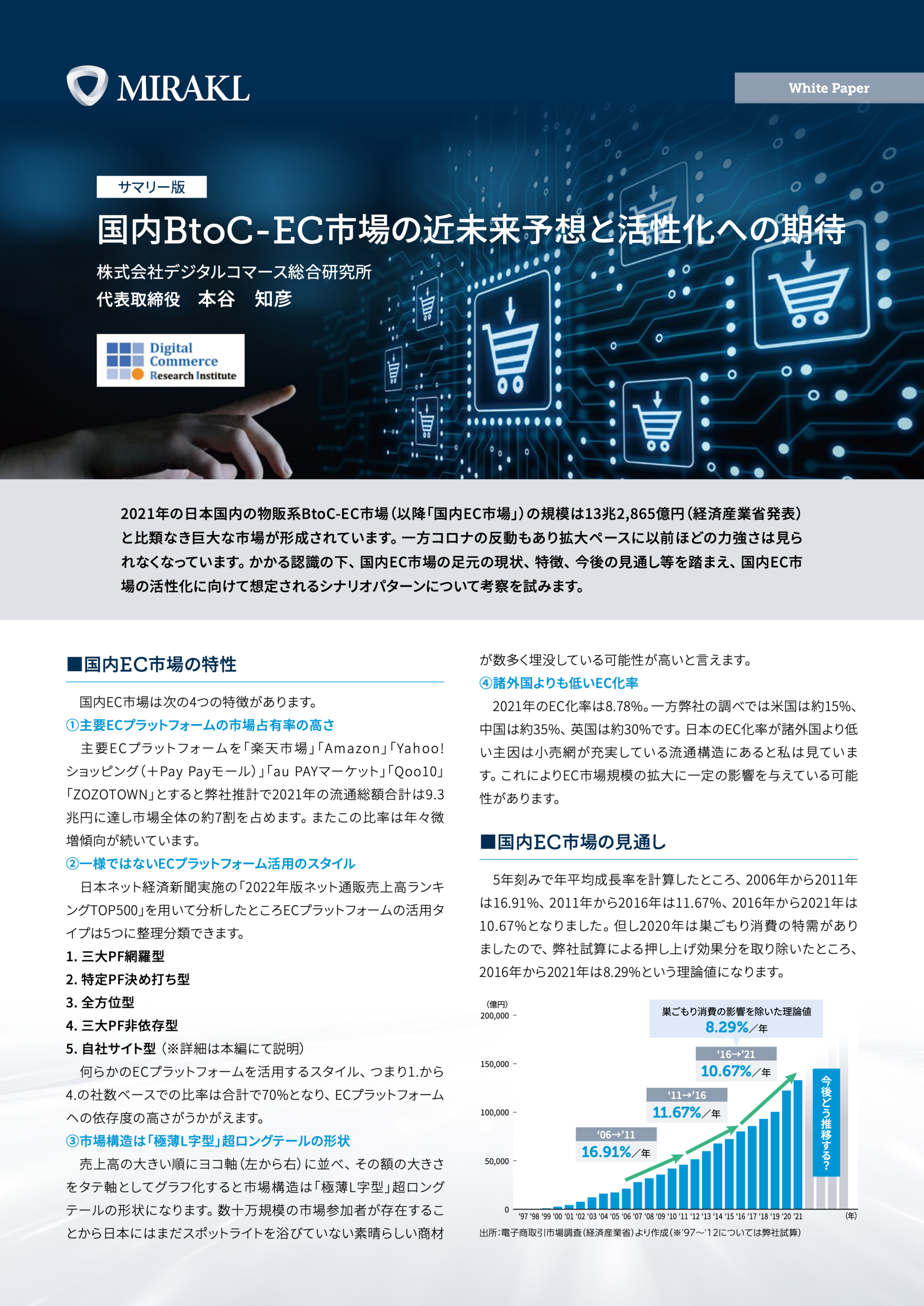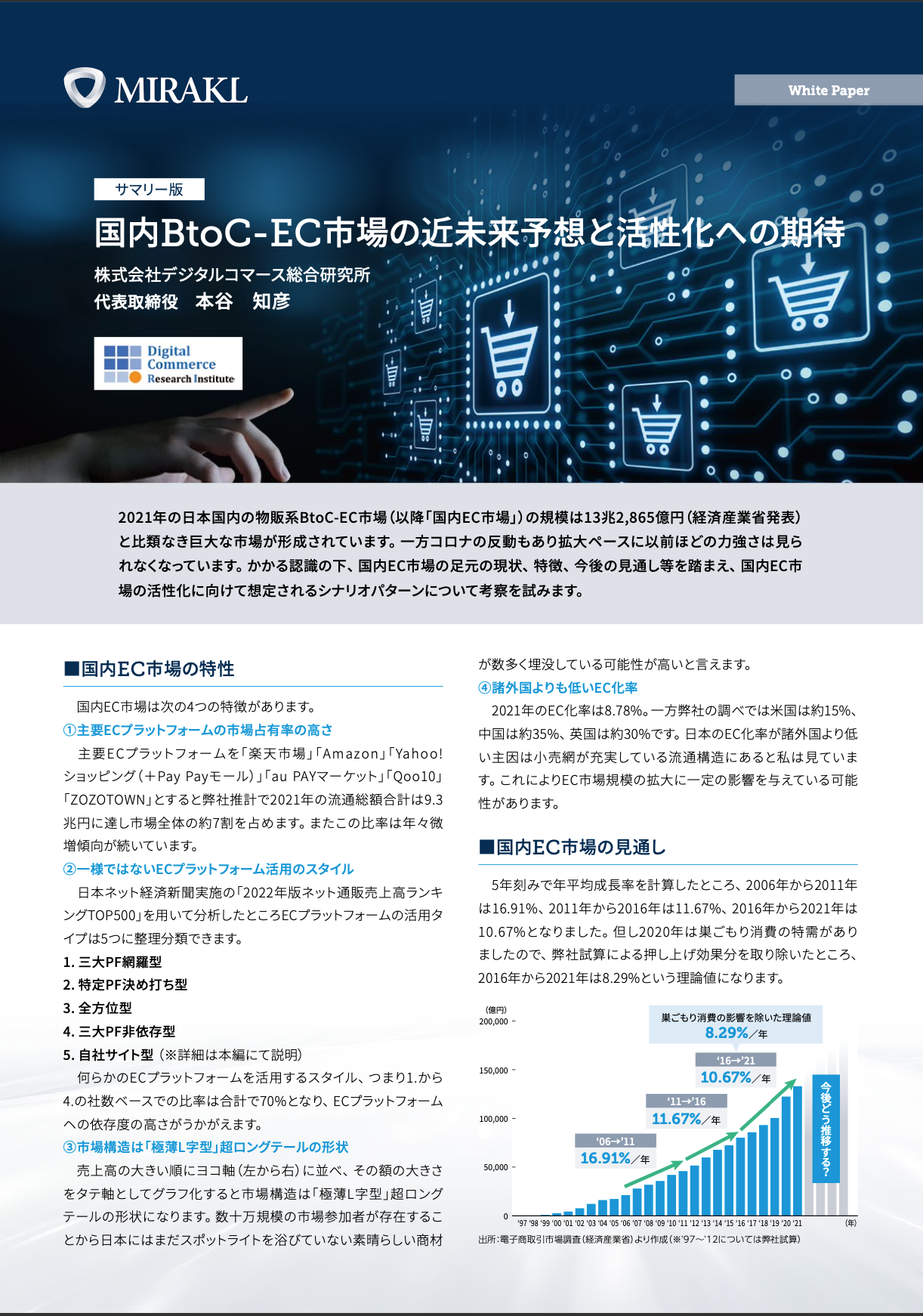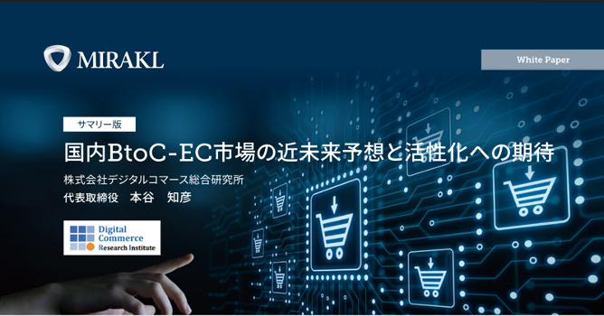 業界初、最先端なエンタープライズマーケットプレイス構築のためのSaaSプラットフォームを提供するMirakl株式会社(本社:東京都港区、代表取締役社長:佐藤 恭平、以下:Mirakl)は、株式会社デジタルコマース総合研究所(以下:デジタルコマース総合研究所)の協力のもと、EC事業推進の一助になることを目指したレポート「国内BtoC-EC市場の近未来予想と活性化への期待」を公開しました。本レポートは、経営者層、新規事業開発者、DX推進者、新規事業開発者、EC責任者様に向けた、新しい事業成長戦略の一環としたEC活性化、収益向上を検討する際の4つのシナリオ提示が特徴です。