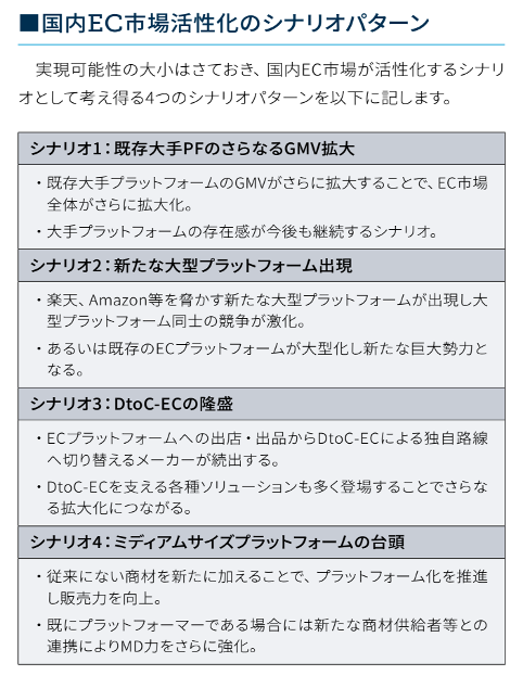 本レポートでは、国内EC市場の足元の現状、特徴、今後の見通し、EC事業推進のフレームなどを踏まえ、国内EC市場の活性化、市場規模のさらなる拡大に向けて想定されるシナリオパターンについて考察をしています。