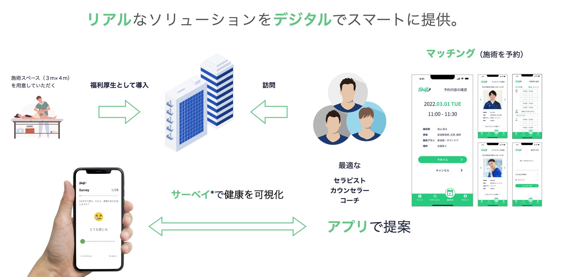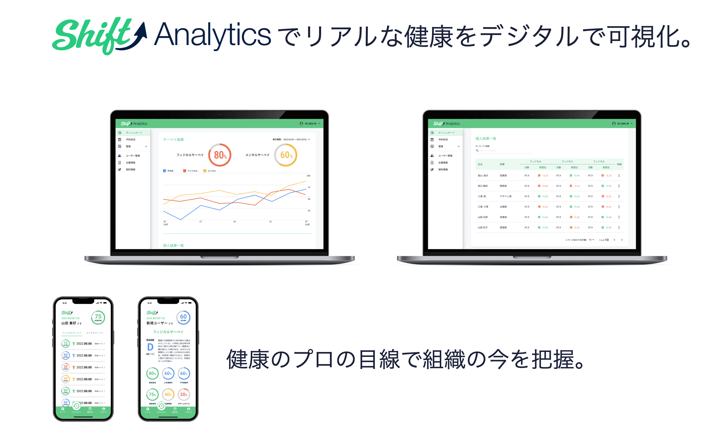 Shiftは、フィジカル(運動機能)から企業の安全衛生をサポートする最先端のSaaSです。最重要項目なのに、最低限でしかできない安全衛生について、医療系国家資格を持つプロが解決します。