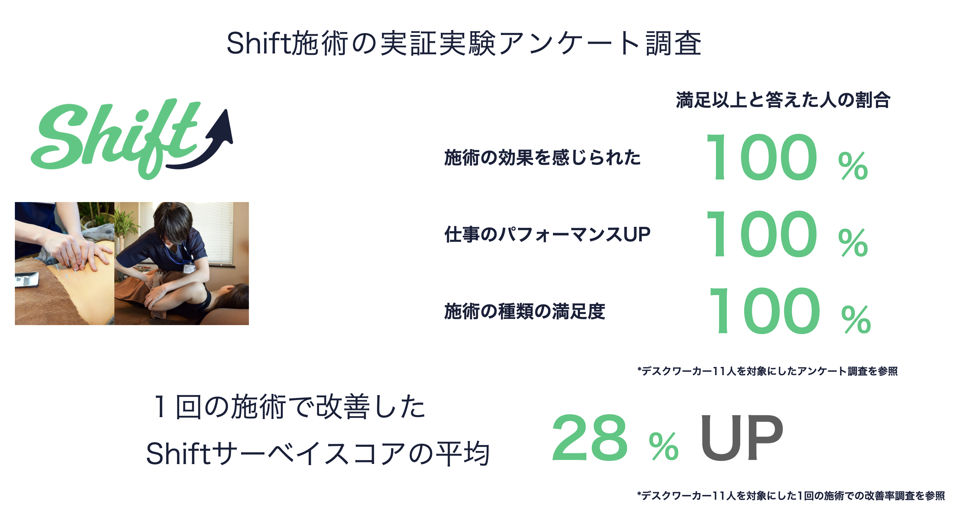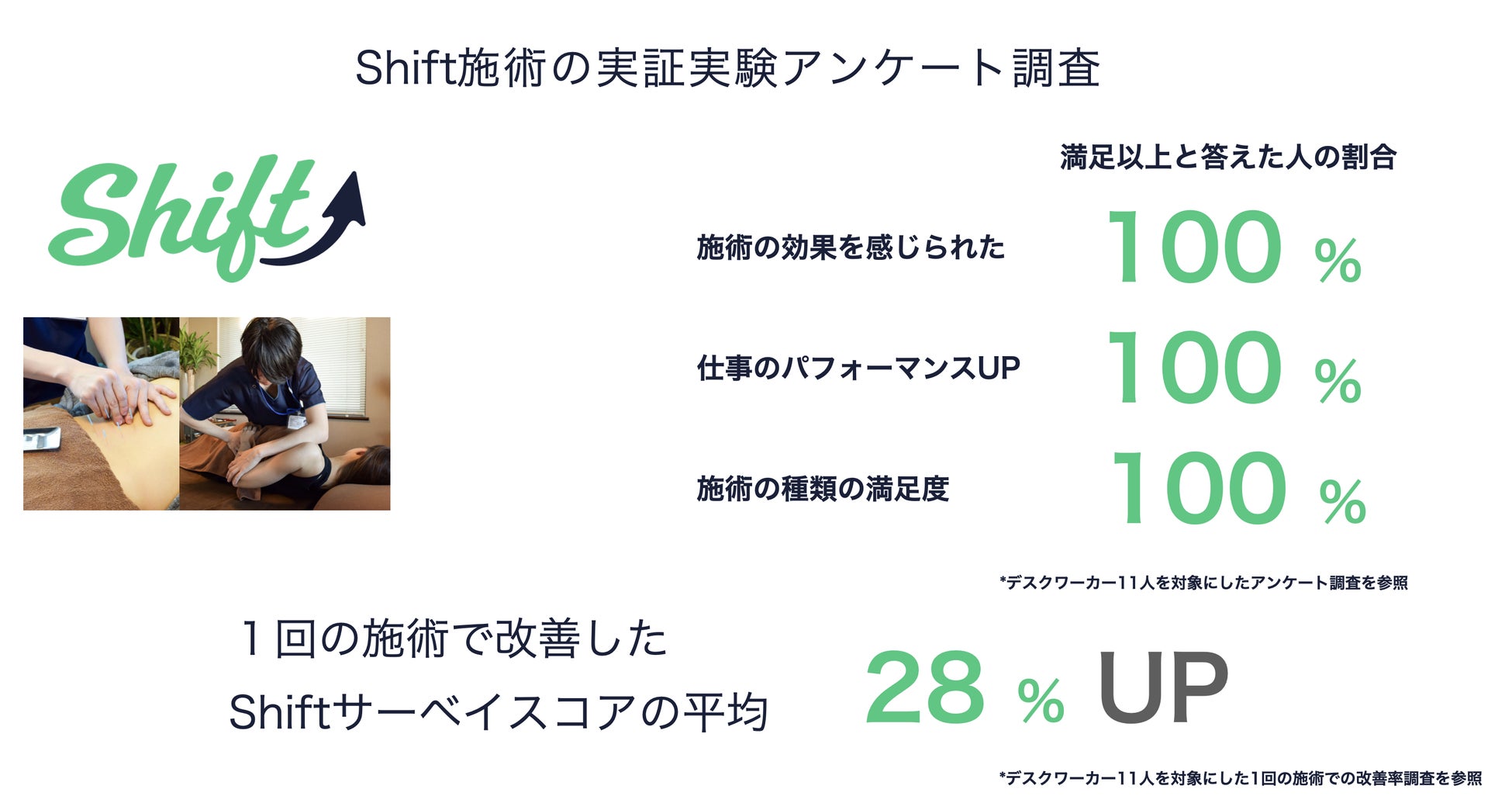 また、施術によるフィジカルサーベイの変化を調査した結果、1回の施術で、サーベイスコアが平均28%も上昇しました。