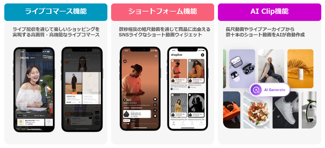 Shopliveは、シンガポールに本社を置くビデオAIテクノロジー企業です。Shopliveでは、ライブコマース機能とショート動画機能、AI Clip機能の3種類のソリューションを提供しています。