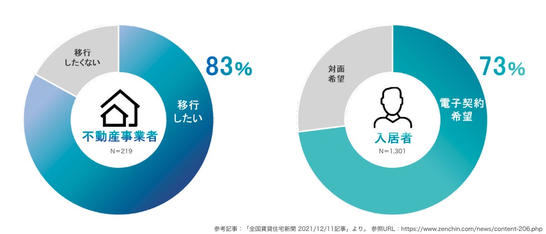 昨年、社会全体のデジタル化を目指すデジタル改革関連法により、宅建業法の一部改正が決まりました。その改正宅建業法が2022年5月18日に施行されます。 これにより、 不動産申込契約時に「重要事項説明や書類手続きのオンライン化」が可能になり、 今後は不動産取引におけるデジタル化が加速することが予想されます。 また、 電子契約に移行したいと回答した不動産事業者は83%存在し、 入居者の73%以上が電子契約を望んでいる(※1)というデータがあることから、 お客さまの利便性向上の観点においても、 電子契約の普及には大きなニーズが存在しております。 以上の状況を踏まえ、 今後の不動産業界における電子契約の普及と、 DX推進を実現する為、 今般の開発を決定いたしました。