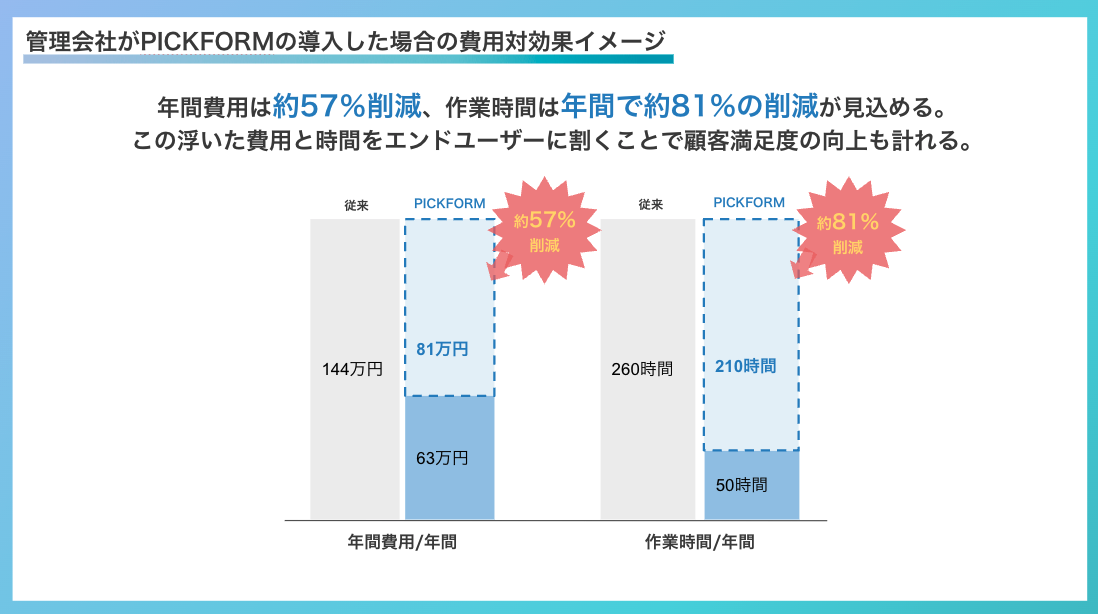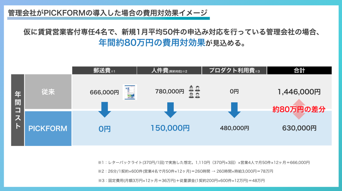 PICKFORMを導⼊した時の費⽤対効果は、仮に賃貸営業客付専任4名で、新規1⽉平均50件の申込み対応を⾏っている管理会社の場合、年間約80万円の費⽤対効果が⾒込める計算となっています。(※4)