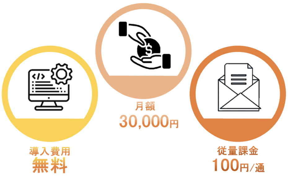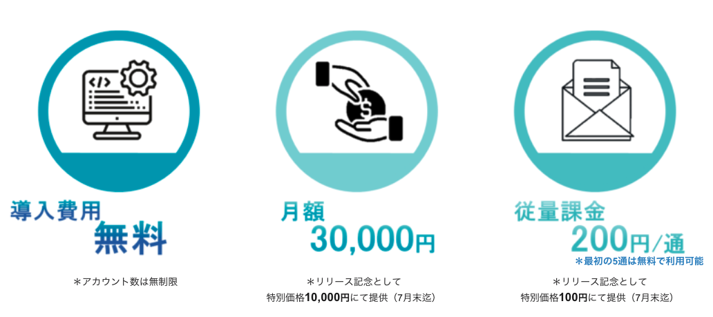 不動産賃貸契約に特化した無駄のない機能設計と、 シンプルなシステム構造とすることで、 基本利用料月額30,000円・200円/1通の料金設定といたしました。 他社の類似サービスでは電子押印部分の機能を外部のベンダーとAPI連携しているケースが大半ですが、弊社は電子押印部分も自社開発(※5)でサービス提供を行うため、業界トップクラスの低価格(※6)の不動産賃貸特化型電子契約サービスを実現いたしました。最初の5通までは無料でトライアルが可能なため、あらゆる管理会社様に、少ないコスト負担で不動産賃貸の電子契約を導入いただくことが可能です。更にリリース記念として、早期申込いただければ7月末までは月額1万円・100円/1通にて提供致します。(売買契約版も同価格にて提供)