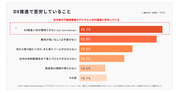 また、不動産事業者がDX推進で苦労していることの1位は「DX推進人材が確保できない」(※3)でした。