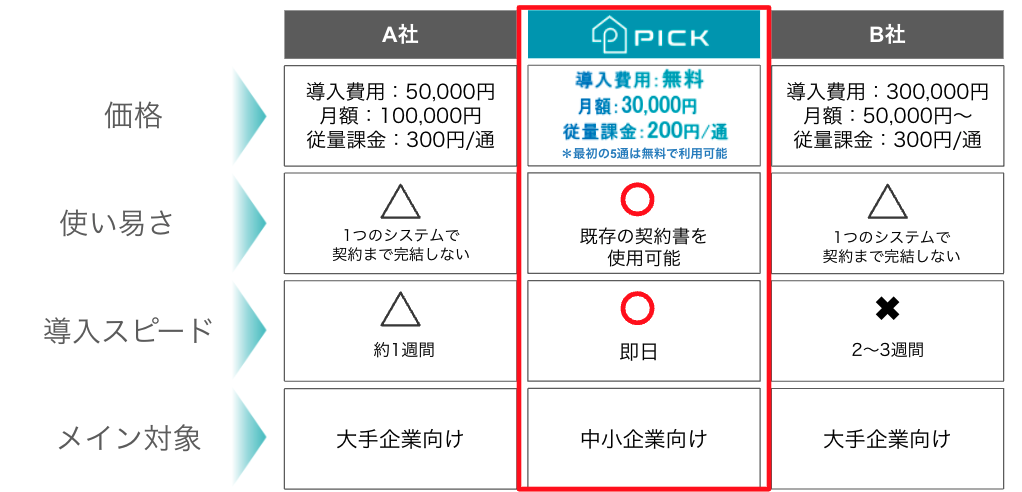 上記の通り、PICKでは、記載させていただいた通り、とにかく”シンプルで簡単”を追求した不動産の電子契約サービス「PICKFORM」をご用意しました。不動産業界のデジタル・トランスフォーメーションのパートナーとして、PICKFORMをお選びいただけると幸甚です。