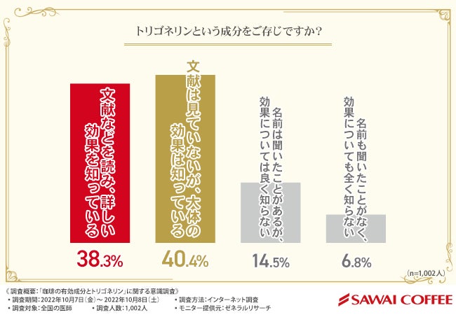そこで今回、【鳥取大学 浦上教授と共同開発】トリゴネリン高含有の『トリゴネコーヒー』(http://www.sawaicoffee.co.jp/goods/torigone.html)ならびに今年8月に製造方法で特許を取得したコーヒーの葉から作るお茶『トリゴネコーヒー茶』(https://www.sawaicoffee.net/torigonetea/)を販売する株式会社澤井珈琲(http://www.sawaicoffee.co.jp/)は、全国の医師を対象に、「珈琲の有効成分とトリゴネリン」に関する調査を実施しました。
