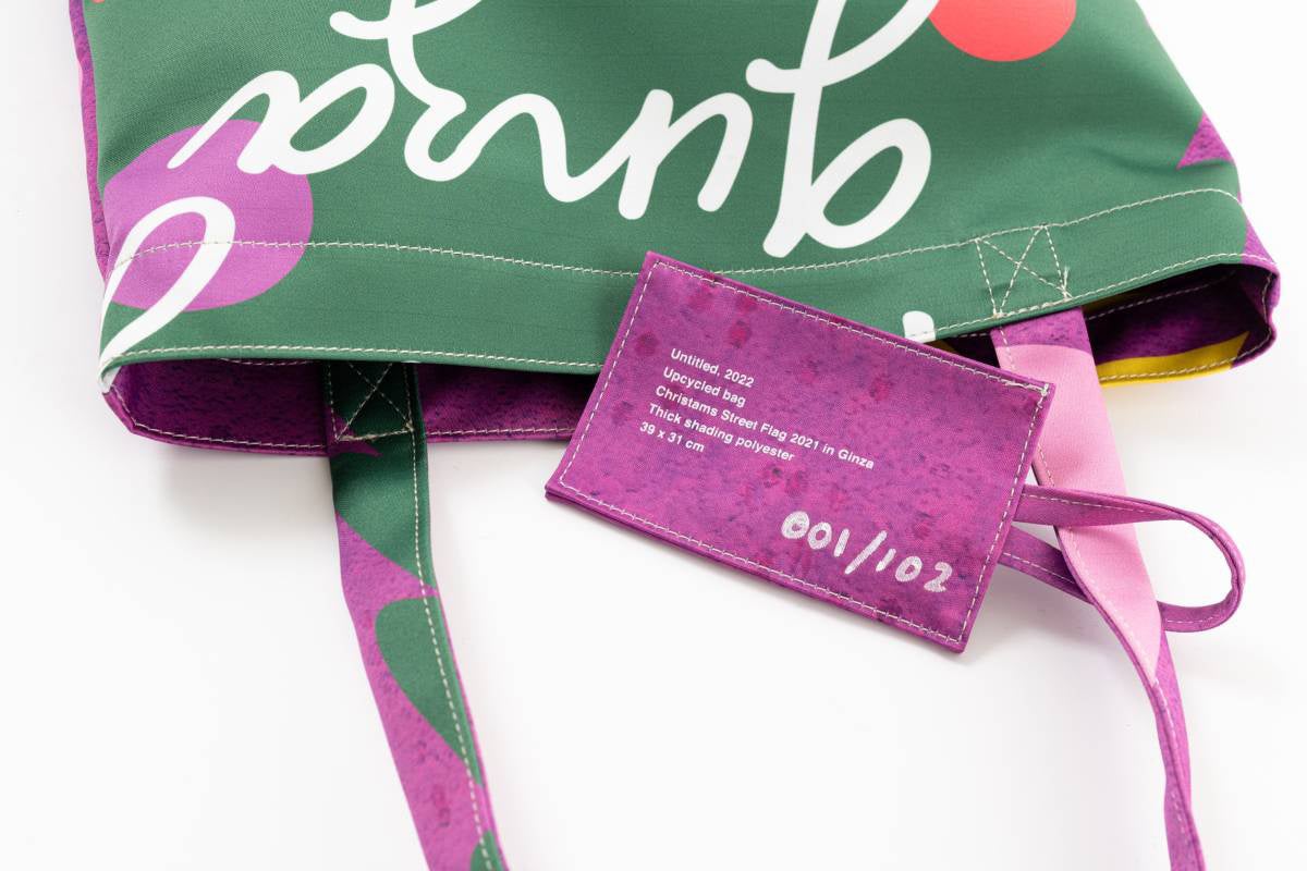 オーソドックスで使いやすい仕様ながら、ワンハンドルにすることでワンポイントアクセントのあるデザインに仕上げています。肩掛け、肘掛けや手持ちなど、様々な持ち方に対応できるサイズ感にしてあります。また、各バッグに付属しているチャームの裏面にも仕掛けがあります。バッグ一つ一つをさながら作品として捉え、絵画作品紹介のフォーマットを引用して文字情報を記載しています。さらにフラッグバッグは街頭フラッグの特性上、生産数が限られているため、それぞれのバッグにはエディションナンバーが手書きで記されています。