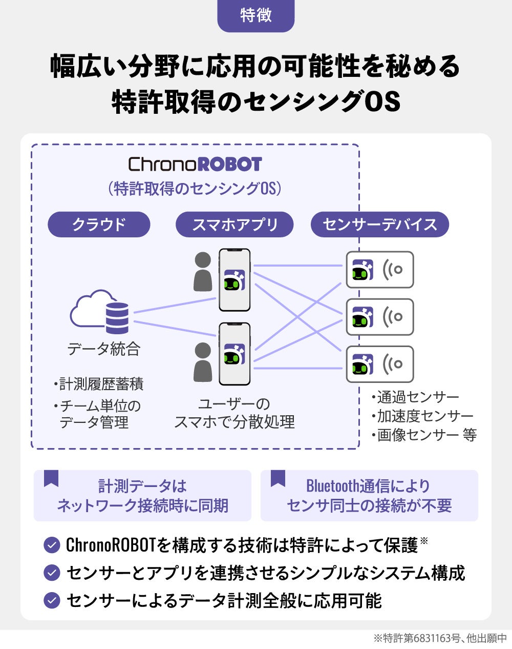 ChronoROBOTは、従来、タイム計測やモーションキャプチャー、ビデオ分析など用途例毎にシステムを構築する必要があったスポーツ向けのセンシングシステムにOSの概念を導入し、さらに利用者のスマートフォンに機能を分散させることで、①低価格で、②設置設定を簡単・手軽にし、③様々なシステムの構築を容易にしました。