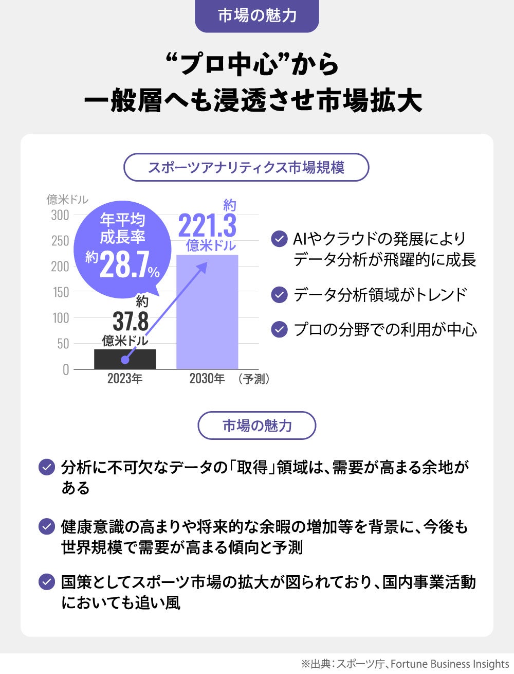 市場も伸びています。スポーツ分析市場は年平均成長率約30%※です。