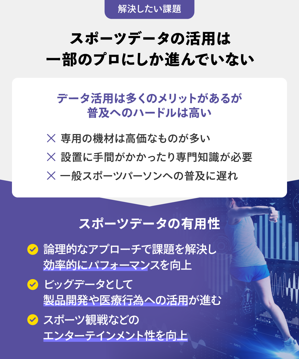 選手のパフォーマンス向上、コンディショニング、チームの戦略策定、観戦などでのエンターテインメント、製品開発などへのフィードバック等、様々なシーンで活用が広がっています。