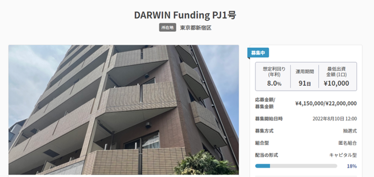 2009年の設立以来、不動産のアセットマネジメントや資産運用用のコンサルティングを手がけてきたダーウィンアセットパートナーズ株式会社(本社:東京都港区、代表取締役:男松祐次、以下当社)は、1万円から始められるオンライン完結型の不動産投資型クラウドファンディングサービス「DARWIN funding」の第1号ファンド出資者募集を8月10日(水)12時より開始いたしました。募集金額は2,200万円です。