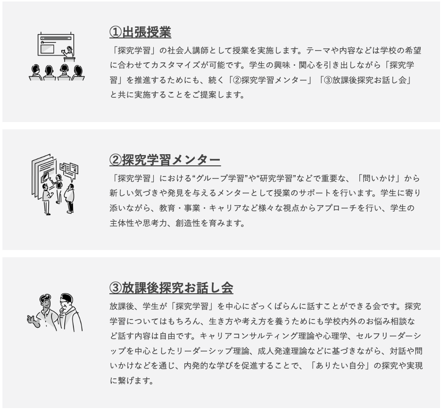 高校で実施される「総合的な探究の時間」(探究学習)を支援する「出張授業」「探究学習メンター」「放課後探究お話し会」などを実施。呉市を中心とした広島県の高校にて教育・ビジネス・社会・キャリアなど様々な角度から探究学習の支援します。