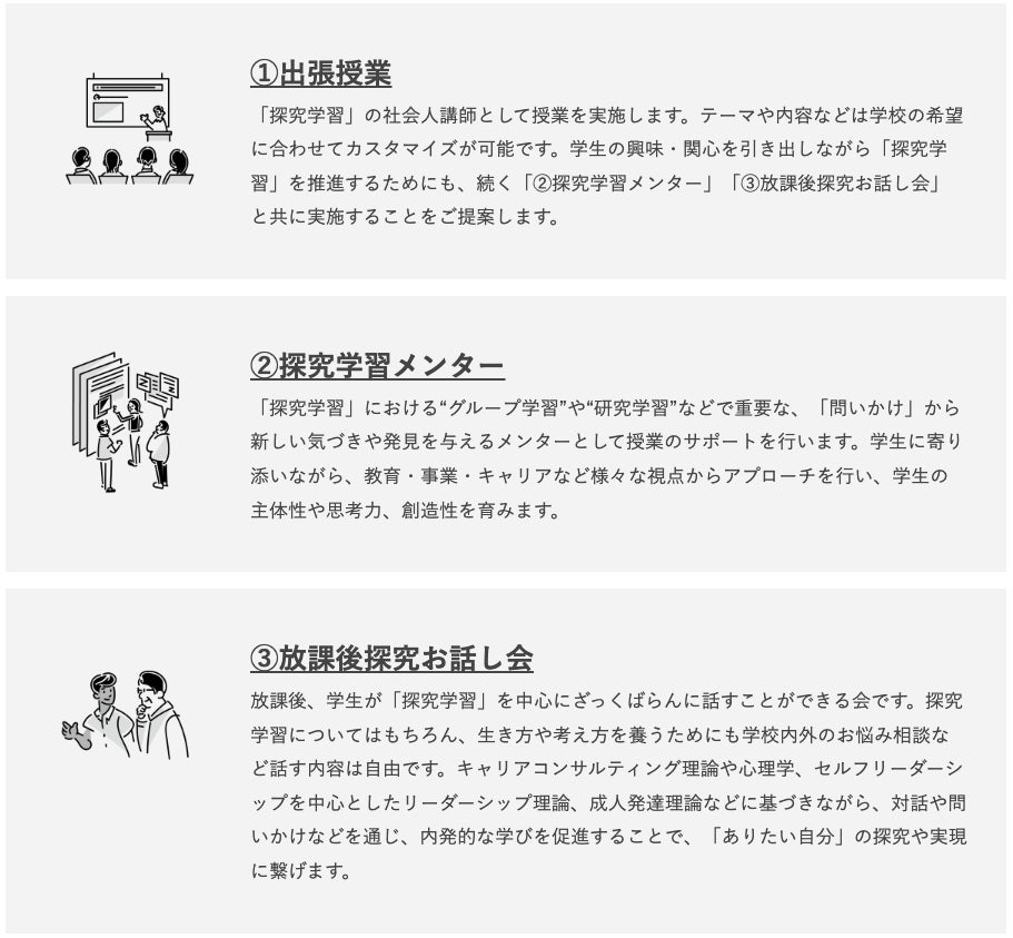 担当者のこれまでのマーケティング事業・インターンシップ事業・キャリア事業などの経験を活かしながら、得意とする“対話”や“問い”などから「気づき」を与え、本人の内発的な学びを促進するコミュニケーションを中心に、学校・先生・生徒に寄り添いながら、「ありたい自分」の探究や実現に向けたサポートを行います。