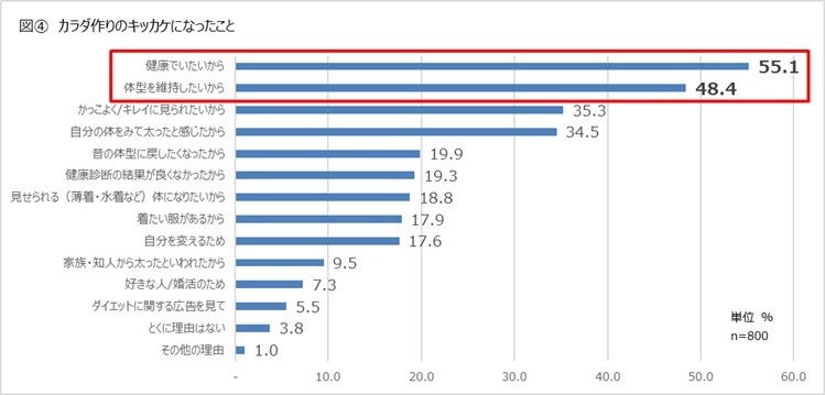 【カラダ作りのキッカケになったこと】について調査したところ、1位が「健康でいたいから(55.1%)」、2位が「体型を維持したい から(48.4%)」で、続いて「かっこよく/キレイに見られたいから(35.3%)」、「自分の体をみて太ったと感じたから (34.5%)」という結果となりました。[図④]健康が最も重視されながらも、自身をより磨こうという意欲が高い人も多いことがうかがえます。