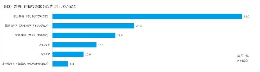 ⚫ 運動後のケア最上位が「水分補給(65%)」、最下位の「オーラルケア(5.4%)」1割にも満たず
