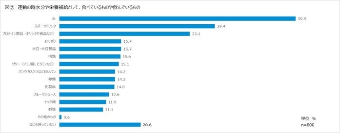 【運動の時水分や栄養補給として、食べているものや飲んでいるもの】を聞いたところ、「水(59.9%)」を半数以上の人が取り入れている他、「スポーツドリンク(39.4%)」、「プロテイン製品(ドリンクや食品など)(33.1%)」、「おにぎり (15.7%)」、「大豆・大豆製品(15.7%)」と続いていく結果となりました。自分のカラダや目的に沿って選んでいる様子がうかがえます。一方で、「なにも摂っていない(20.6%)」人も一定いることから、注視したい結果になりました。[図⑦]