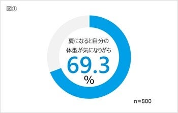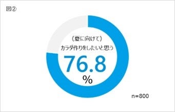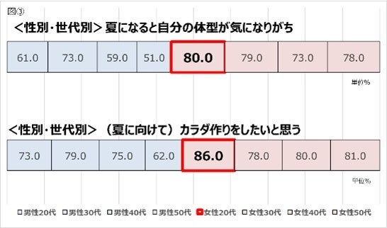 【ご自身のカラダ作り(減量・体型づくり・体型維持)について】について調査したところ、「夏になると自分の体(体型)が気 になりがち」と答えた人は69.3%[図①]という結果でした。さらに、「(夏に向けて)カラダ作り(減量・体型づくり・体型 維持)をしたいと思う」と答えた人も76.8%[図②]にも及んだことから、夏場の体型への意識とカラダ作りへ意欲向上の相関性がうかがえます。 性別・世代別で見ると、中でも20代の女性が高く、「夏になると自分の体(体型)が気になりがち」が80.0%、「(夏に向けて)カラダ作り(減量・体型づくり・体型維持)をしたいと思う」が86.0%と回答。[図③]どちらも全体平均よりも上回る 結果となりました。