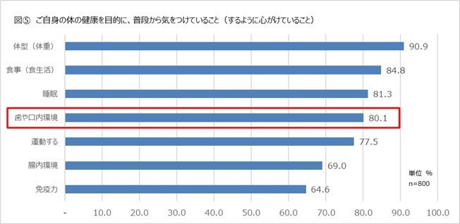 【ご自身の体の健康を目的に、普段から気をつけていること(するように心がけていること)】は、1位が「体型(体重)(90.9%)」、2位が「食事(食生活)(84.8%)」という結果でした。そして、「歯や口内環境(80.1%)」も上位の結 果となり、オーラルケアも約 8 割が心がけていることがわかります。[図⑤]