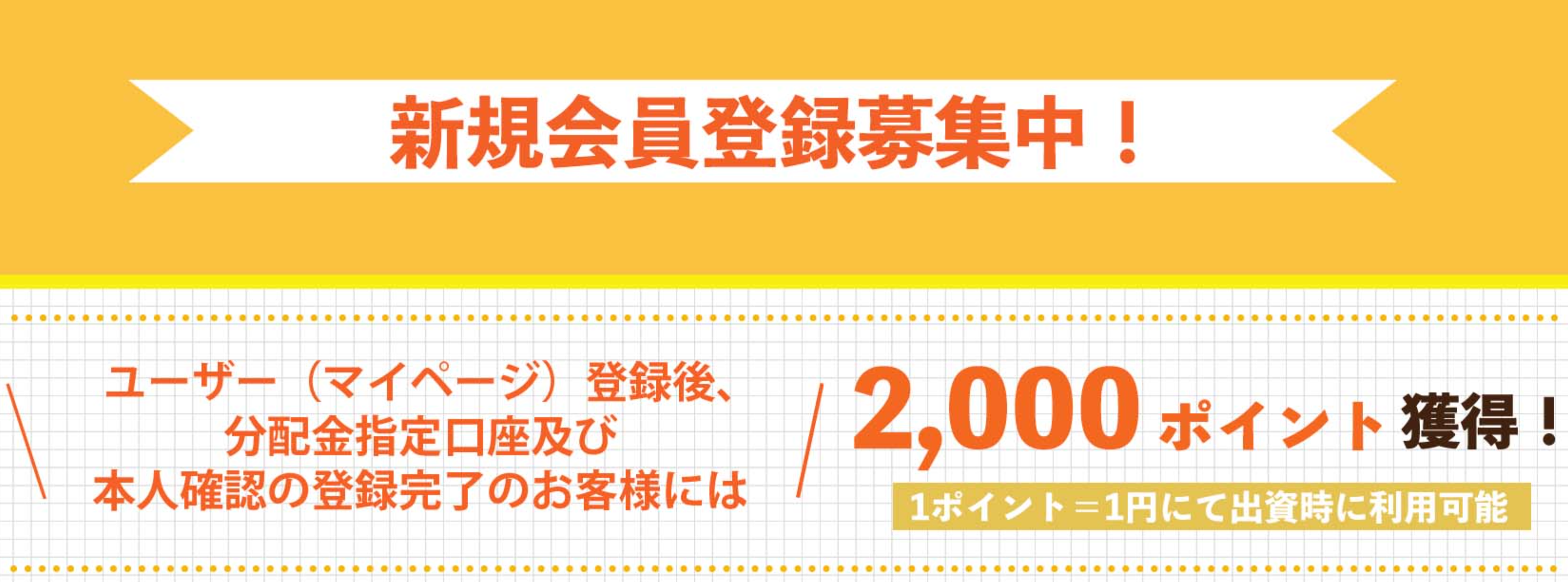- 新規ユーザー(会員)登録・・・当社商品を出資する際には、先ずユーザー登録(本人確認書類のアップロード、口座登録)が必要となります。 ユーザー登録が完了後、出資申込の際にご利用できるポイント(1P=1円)として、2000ポイントを付与 会員登録サイト https://aidmybank.com/user/pre_regist